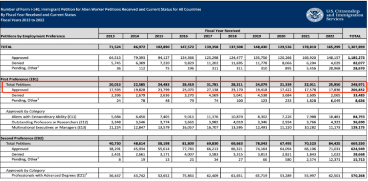 重点看两个数据,申请总数(total petitions)和获批数量(approved)。最近10年,申请总数接近25万,21万人获批,获批率高达83%。