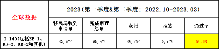 2023财年第一季度和第二季度,EB-2接收申请数为41,325份,完成审理46,155份,其中获批 41,817份,拒签4,338份,通过率为90.6%(其中NIW 接收申请16,699份,完成审理19812份,获批16734份,拒签3078份,通过率为84.5%)。
