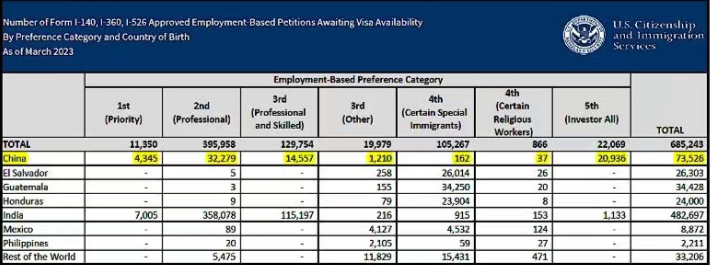 另外,根据美国移民局公布的最新数据,截止至2023年3月,已获批I-140、I-360,I-526等待签证的情况,中国出生申请人等待各类别的签证EB分别如下,EB-1类签证有4345人,EB-2类签证有32279人,EB-5类签证有20936人。