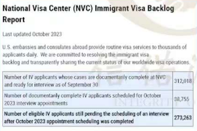 截止至2023年9月30日,申请在NVC已完成并等待面谈的移民申请人数量为312,018人(与上月相比下降了2,835);