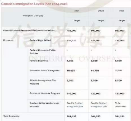 年经济类移民的移民名额为281135人,到了2025年和2026年名额每年各增加到301250人。