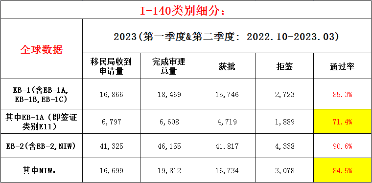 2023财年第一季度和第二季度,EB-2接收申请数为41,325份,完成审理46,155份,其中获批 41,817份,拒签4,338份,通过率为90.6%(其中NIW 接收申请16,699份,完成审理19812份,获批16734份,拒签3078份,通过率为84.5%)。