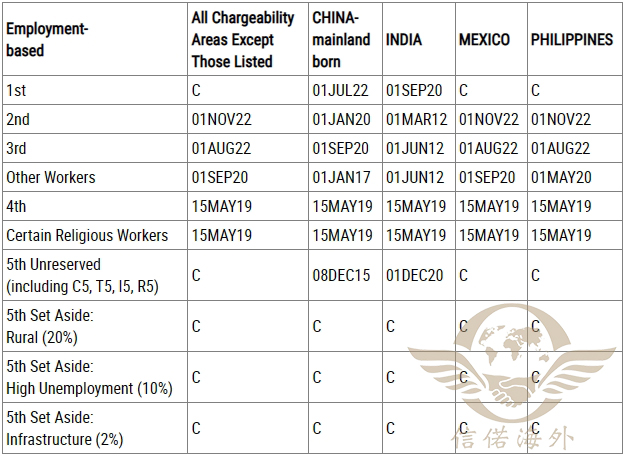 美国职业移民签证排期表,表B的情况: